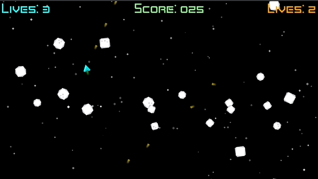 You and a partner share one screen, dodging and destroying asteroids that split into smaller, faster chunks when hit. Clear each wave to advance to the next stage, where even more asteroids await. Lose all your lives and didn't manage to pickup an extra? Don't worry if your Partner can save the day you can continue, if not.... Game over. But don't worry, you can always try again.
